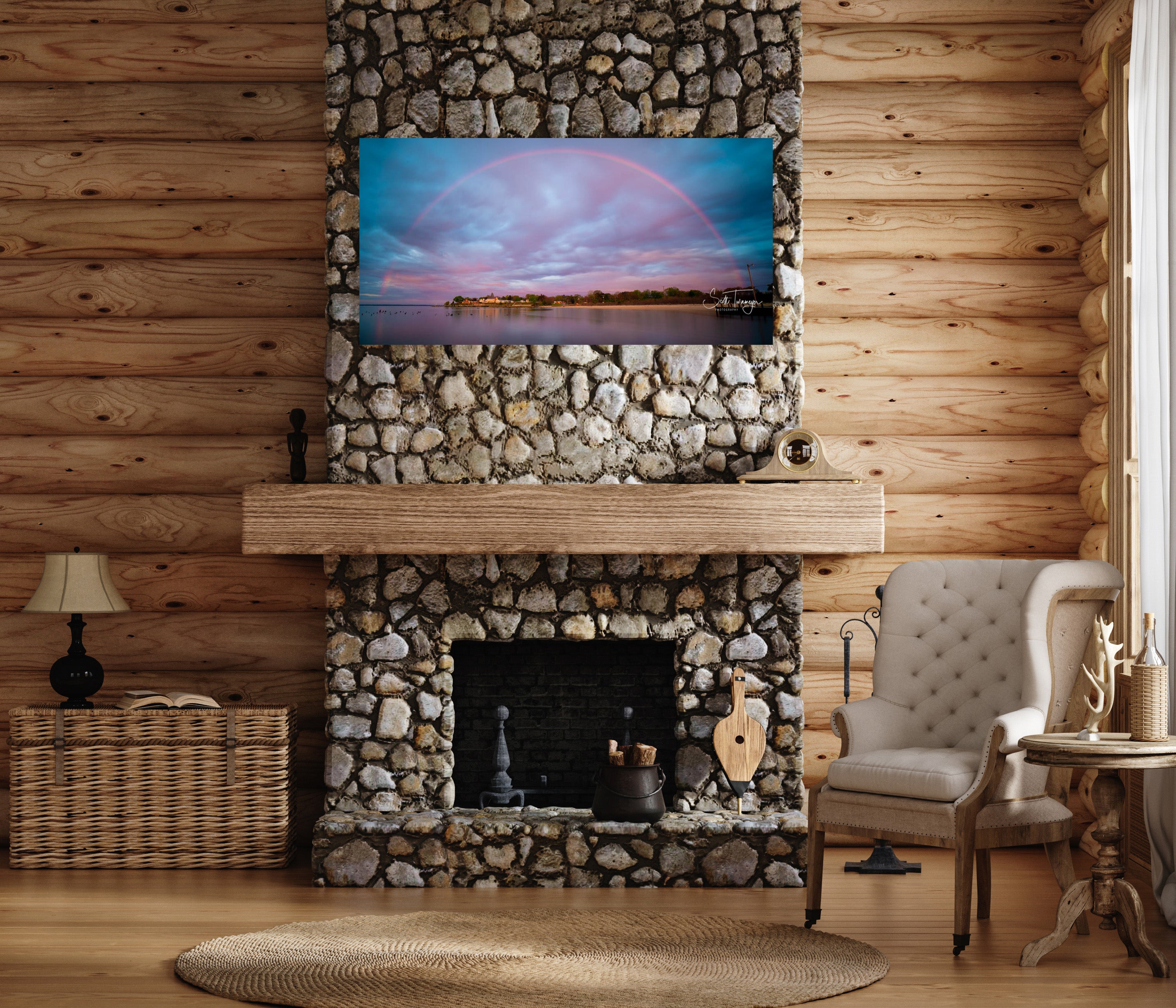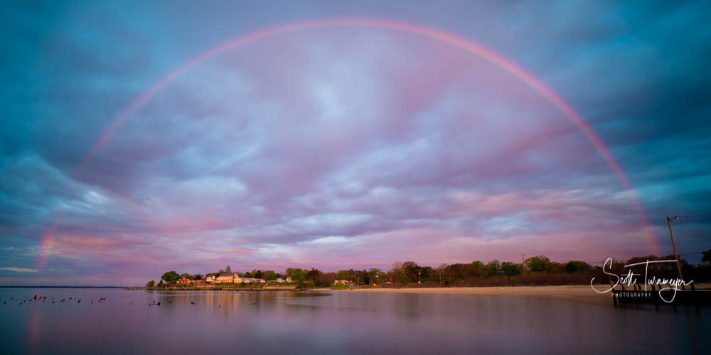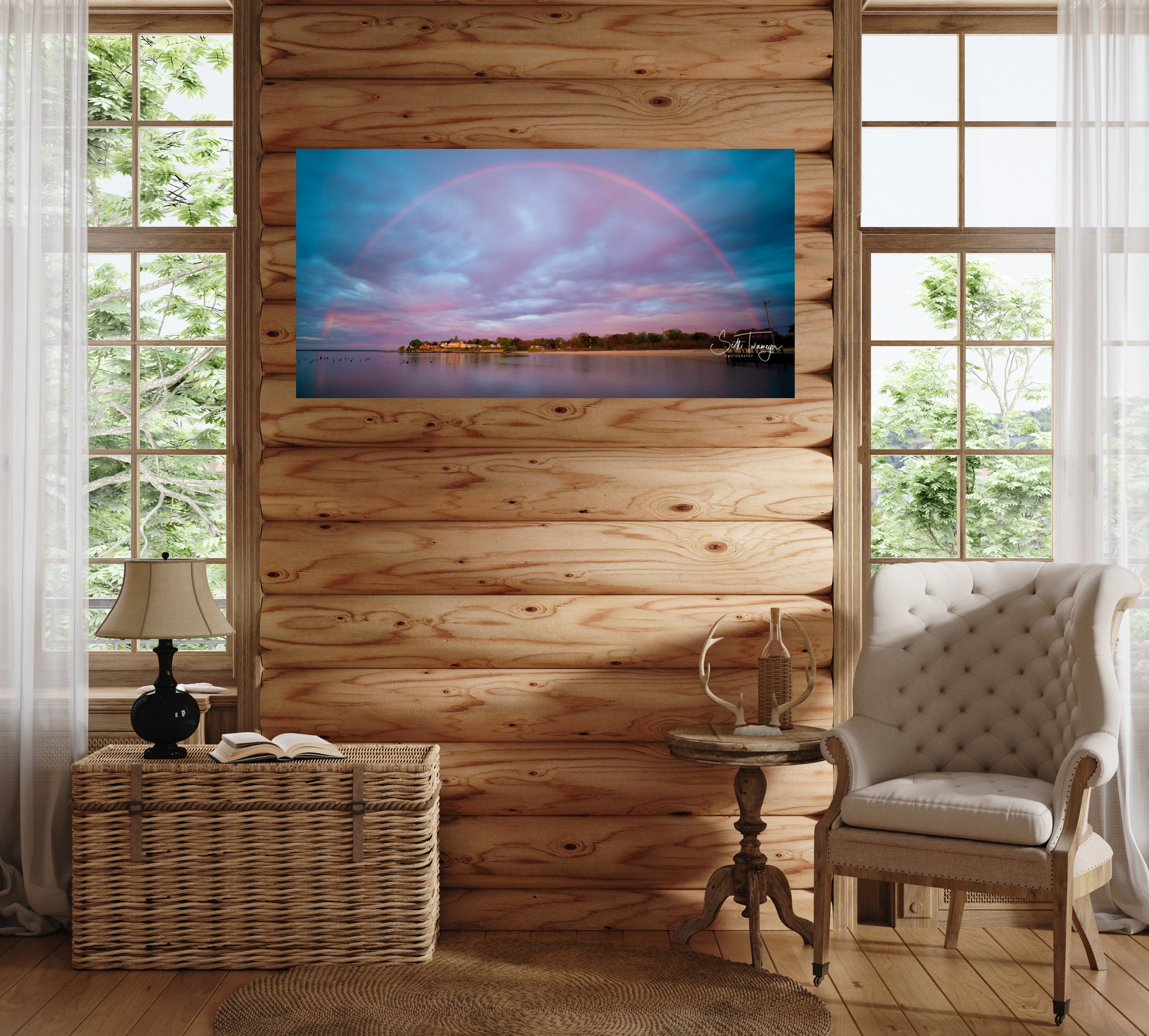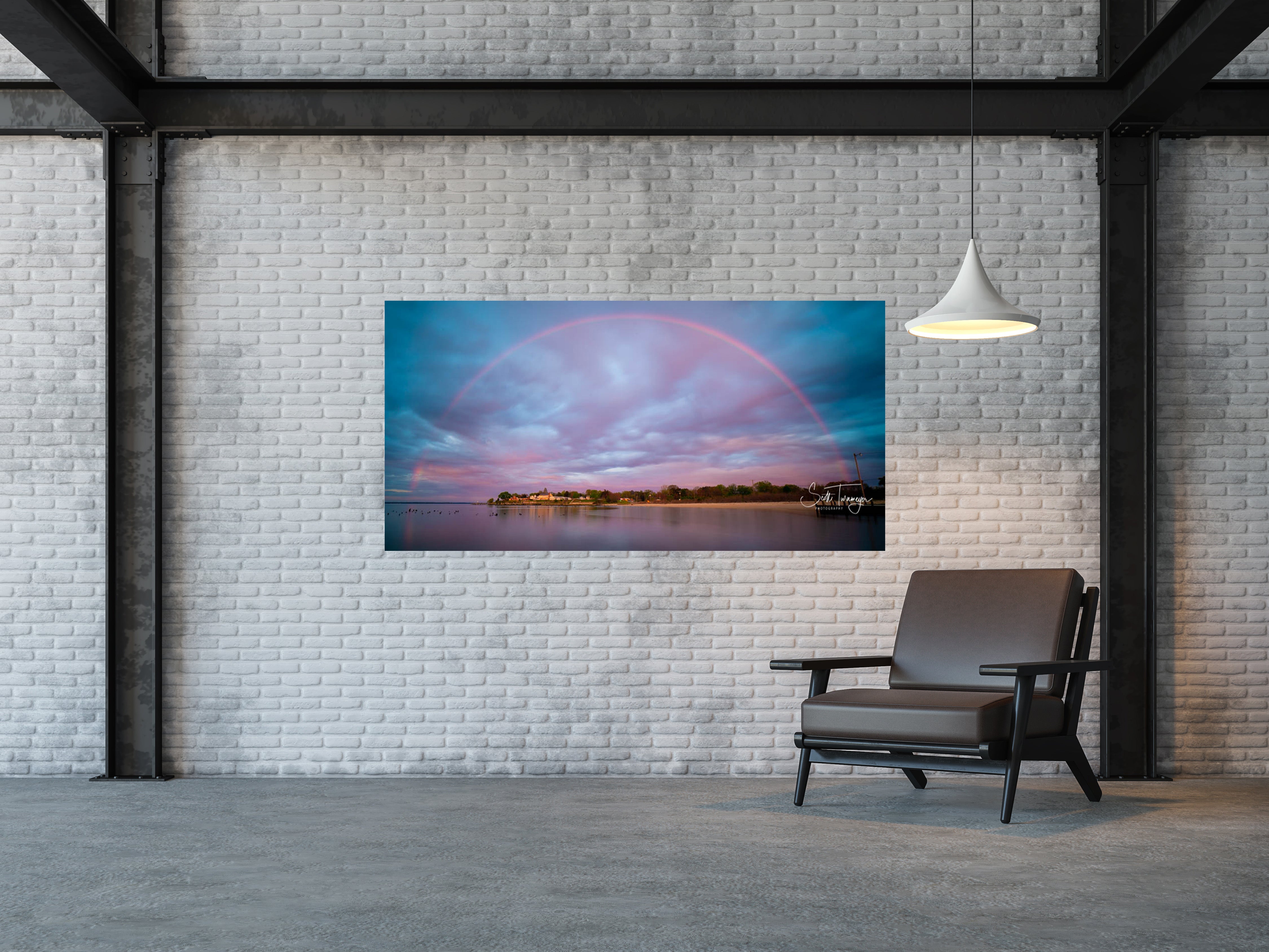 Experience the serene beauty of nature captured in "Rainbow Sunset," a breathtaking fine art photograph by Scott Turnmeyer. This stunning piece showcases a full, vibrant rainbow arcing gracefully across the sky, emerging after a passing thunderstorm near Colonial Beach, Virginia. The late afternoon sun bathes the landscape in a warm, golden light, enhancing the vivid colors of the rainbow and the rich textures of the surroundings.