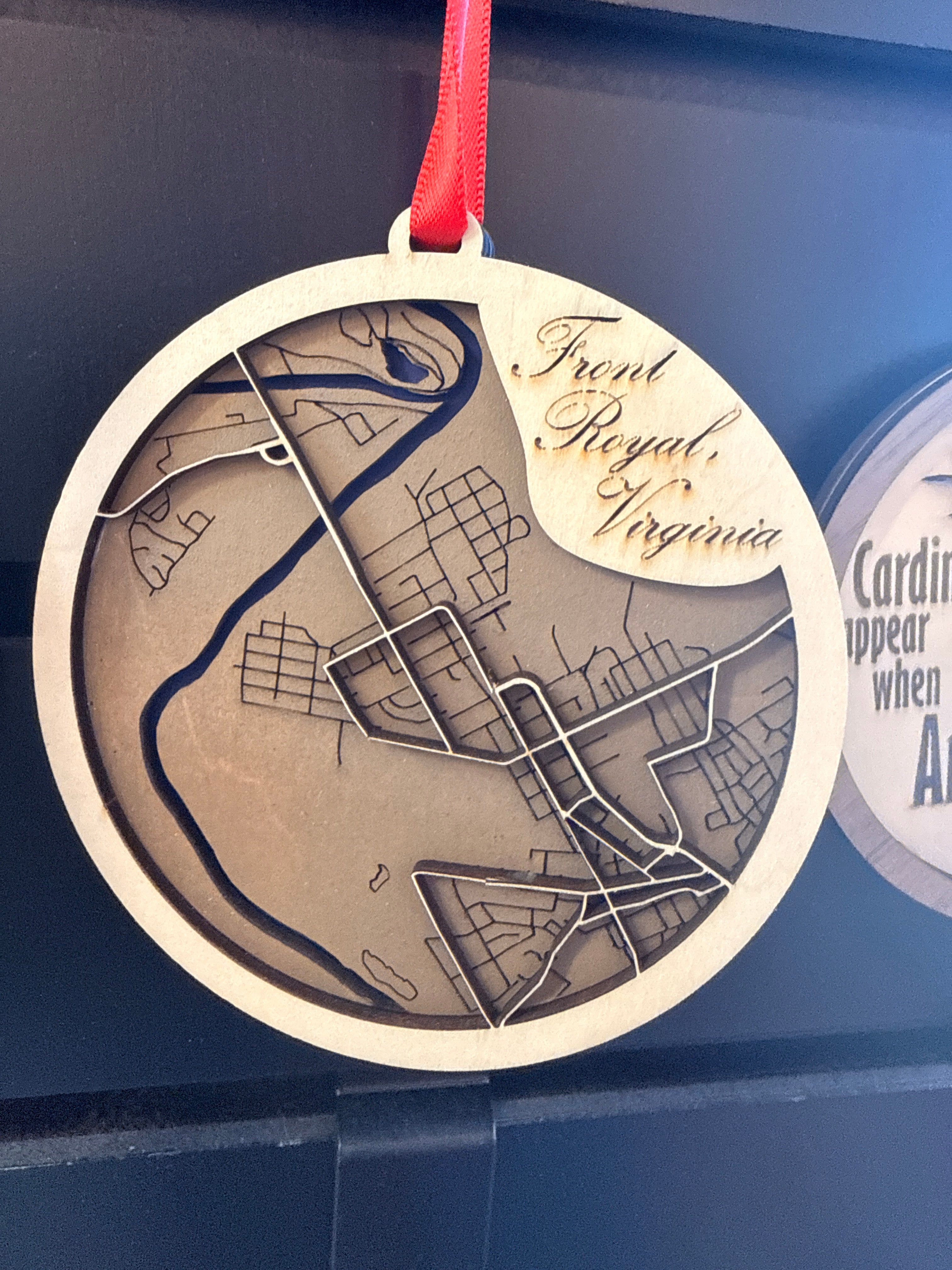 Beautiful laser engraved wood ornament of the state of Virginia.Custom designed and made by us! Comes with red ribbon.
