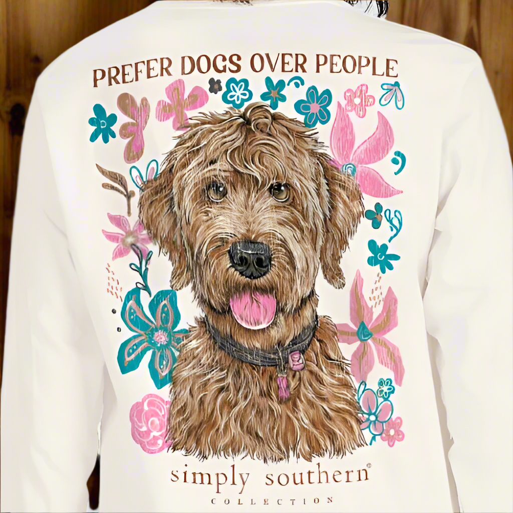 Show your dog-loving pride in this Simply Southern long sleeve T-shirt featuring a sweet pup surrounded by a floral print and the fun phrase: Prefer Dogs Over People. Made from soft, breathable cotton, this women’s graphic tee blends comfort, humor, and Southern charm. Perfect for layering, lounging, or walking your furry best friend. Available in Adult sizes S–XXL. Adult XS and Youth S–L available by custom order (approx. 3 weeks).