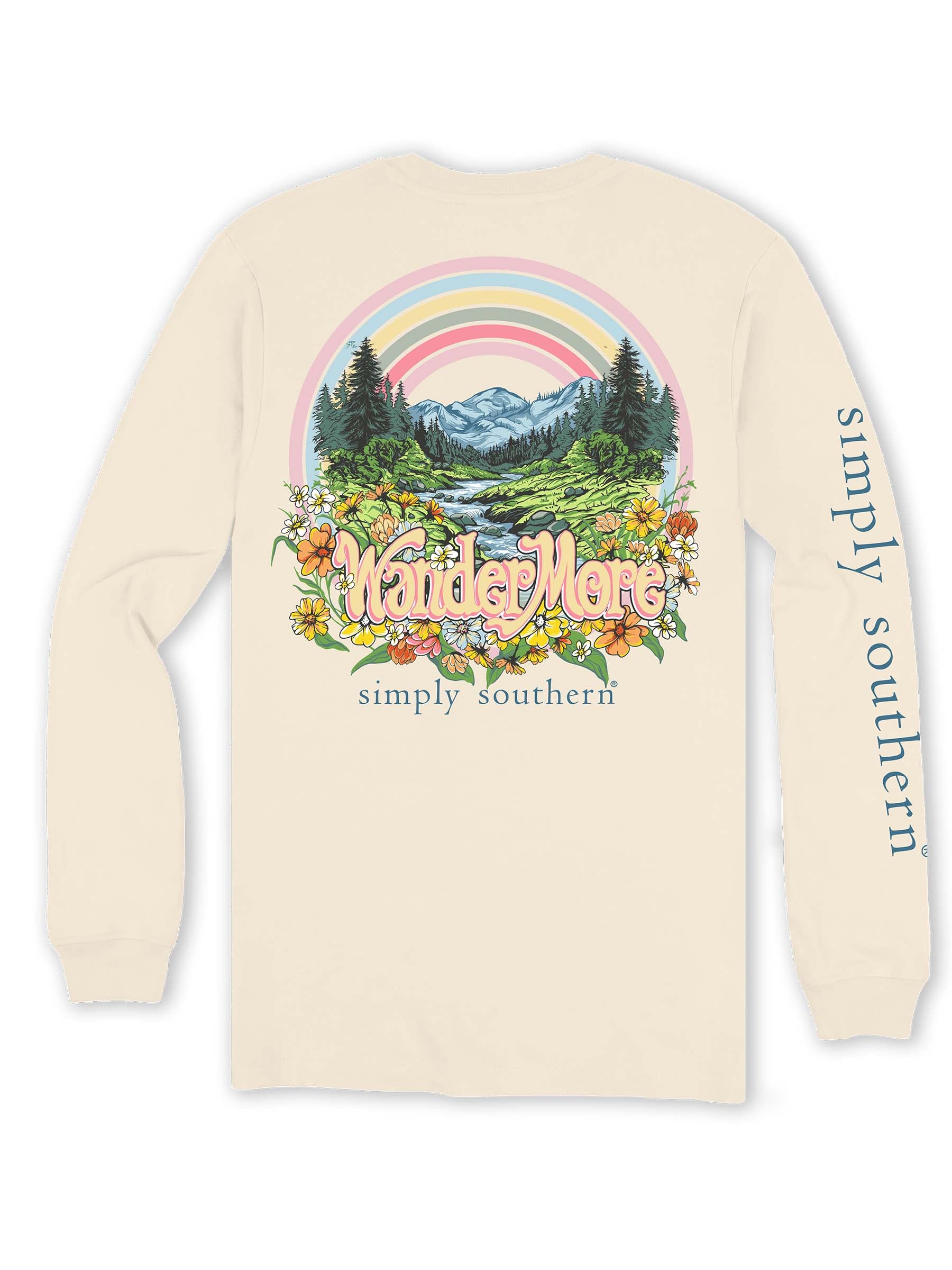 Embrace the call of the wild with the Simply Southern Women's Wander More Long Sleeve T-Shirt. Featuring a stunning mountain scene that captures the beauty of nature, this tee is perfect for adventurers at heart. The serene landscape, coupled with the inspiring "Wander More" slogan, reminds you to explore new horizons and seek out life's adventures. Made from soft, durable fabric, this long sleeve tee ensures comfort whether you're hiking trails or enjoying a cozy day indoors. Perfect for layering or wearing on its own, it's a must-have for nature lovers who love to wander!