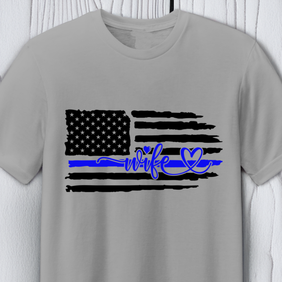 Police Wife T-Shirt – Short Sleeve, Cotton Blend, Patriotic Flag Design