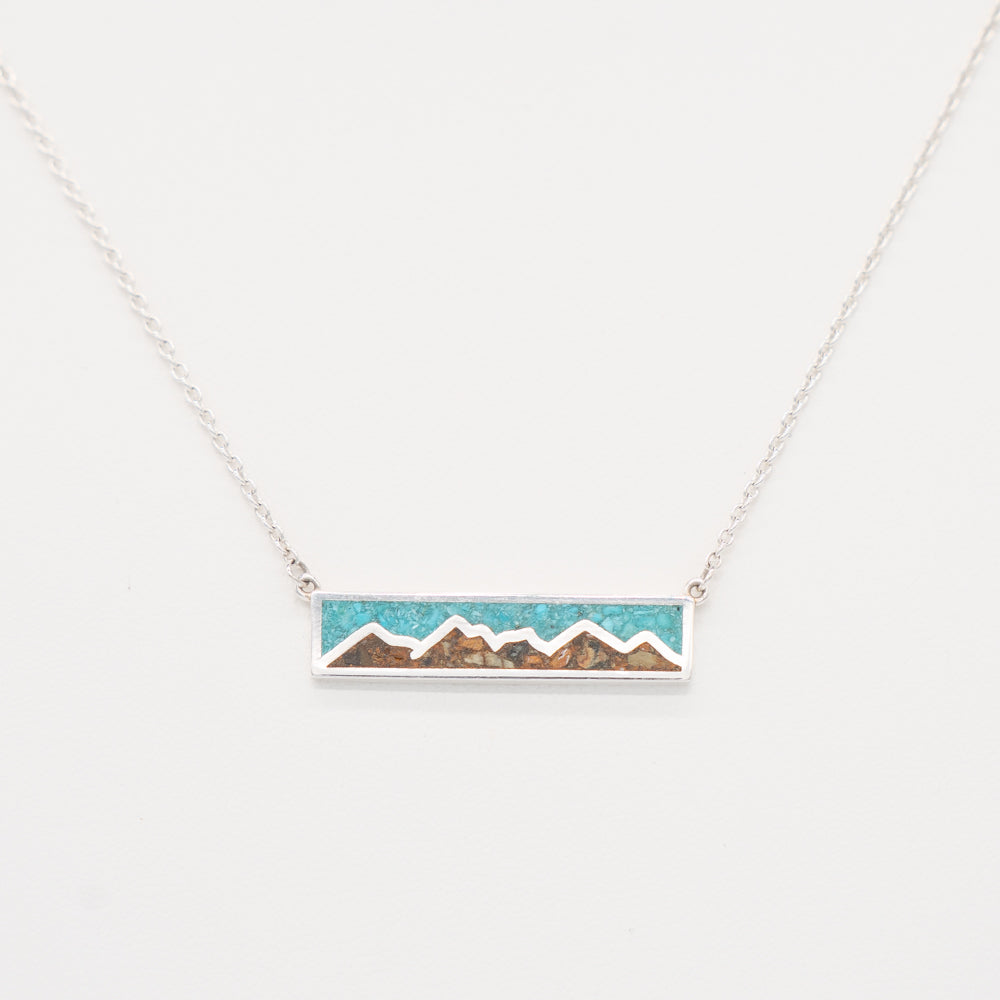 Elevate your style with the Mountain Sky Bar Necklace, a distinctive piece crafted from high-quality .925 sterling silver. This exquisite necklace features a mountain bar design with a sky adorned in natural turquoise and the mountains containing elements from the scenic Blue Ridge Mountains in Virginia.