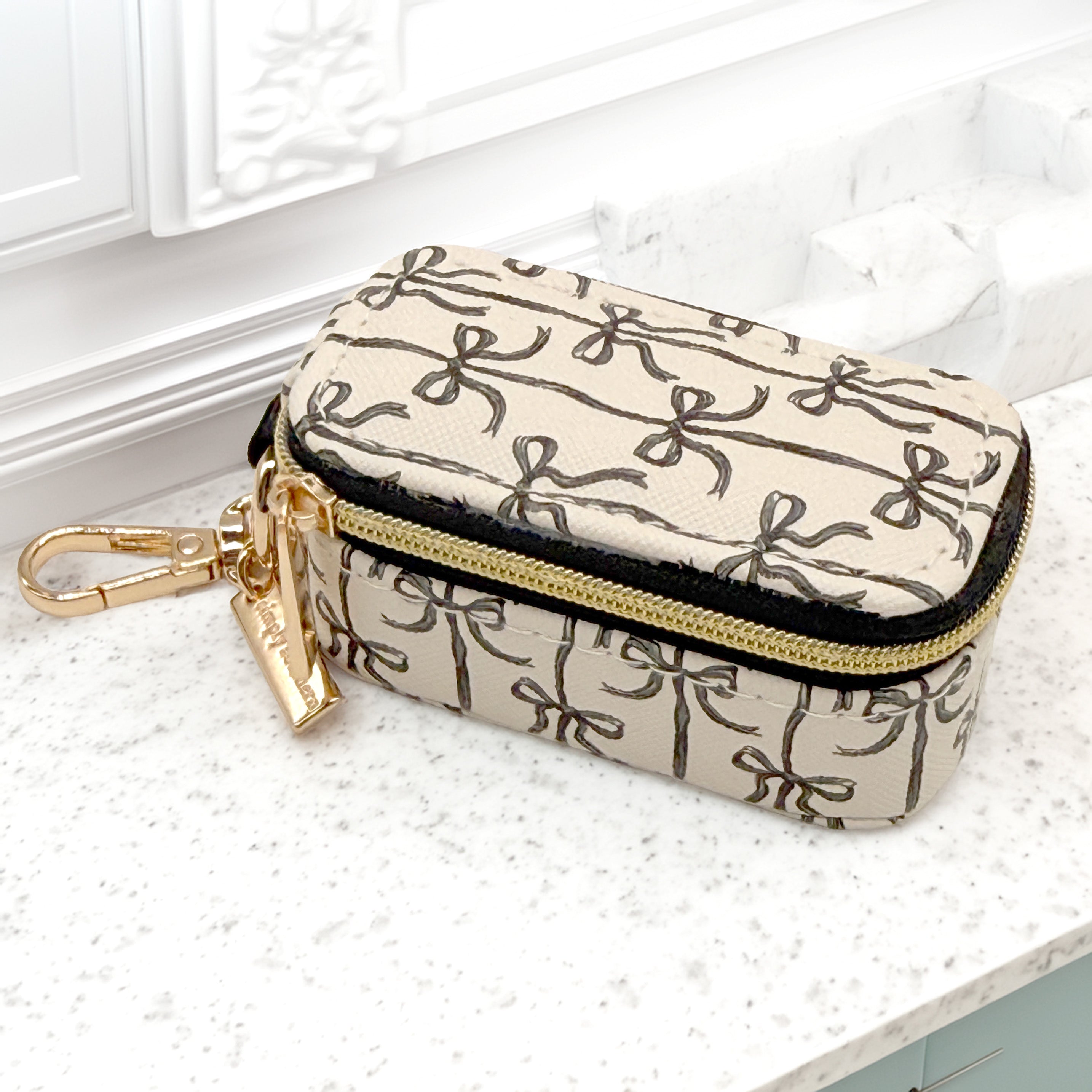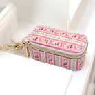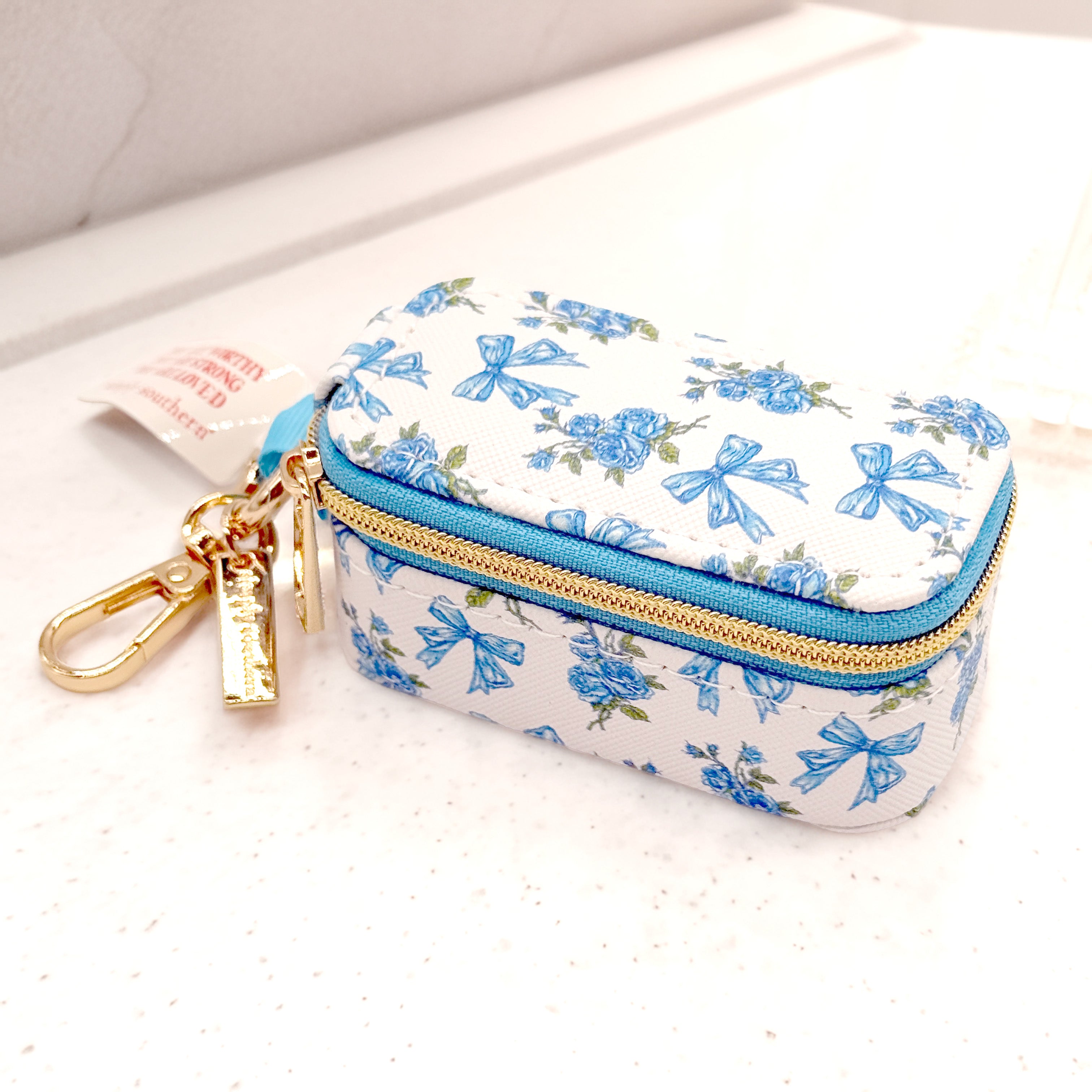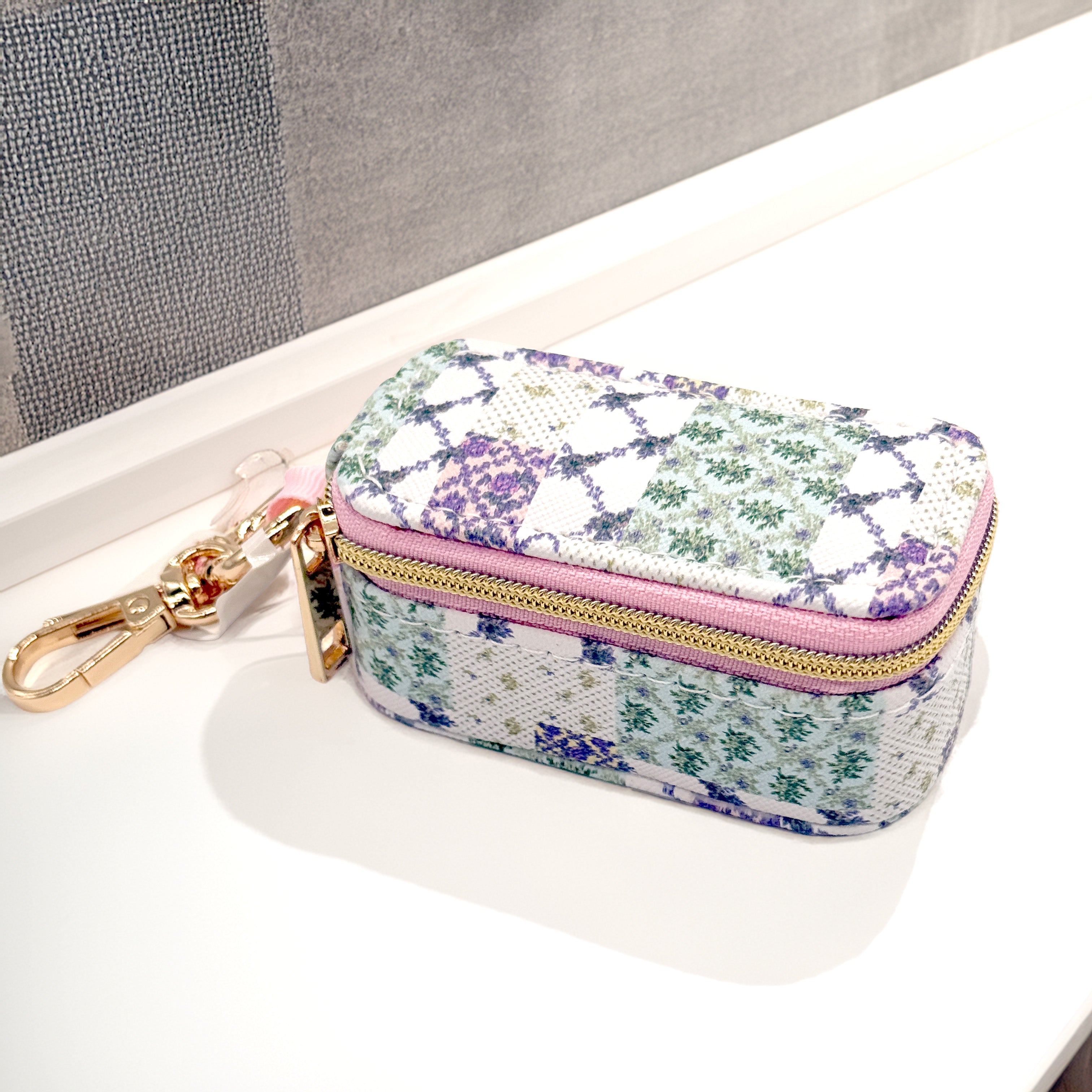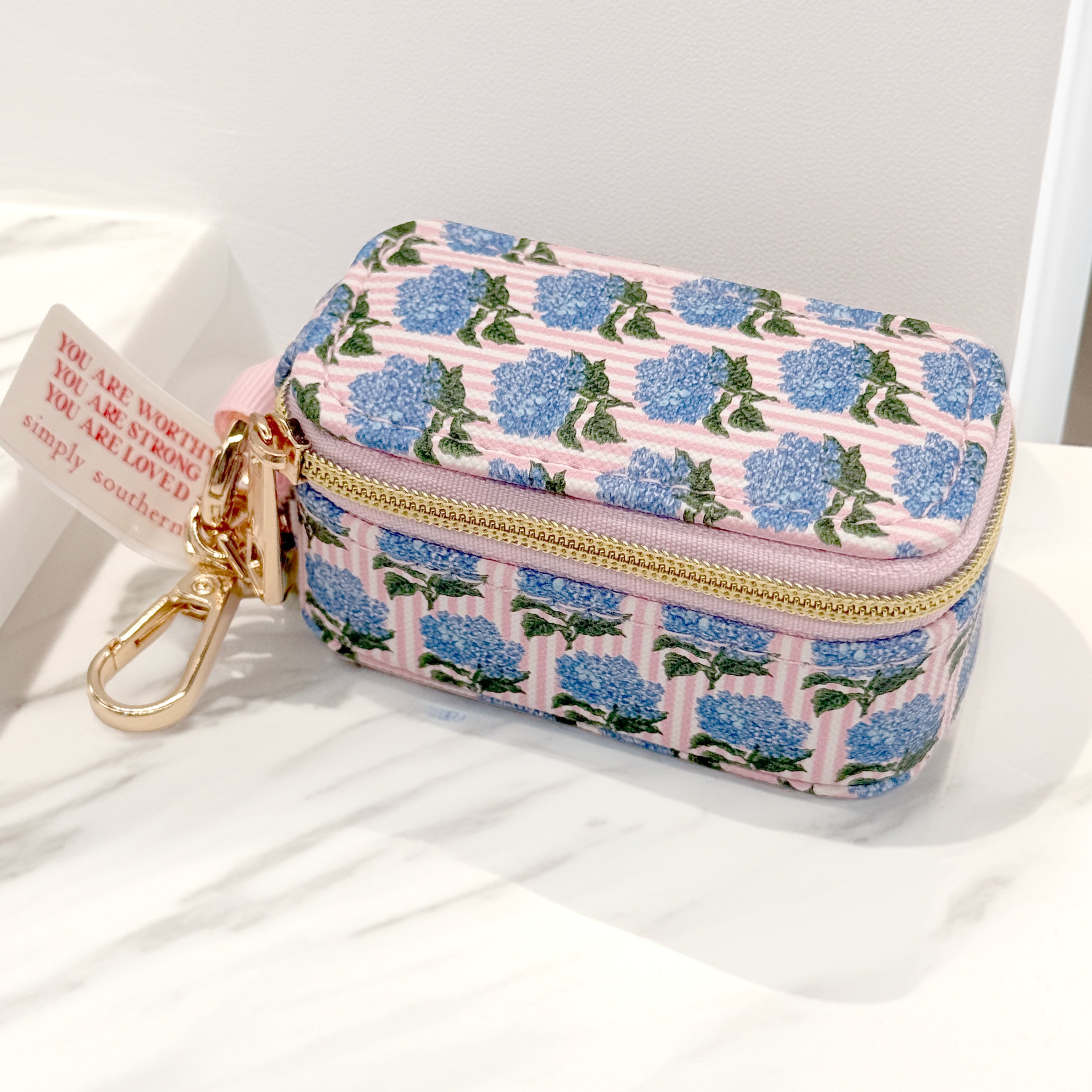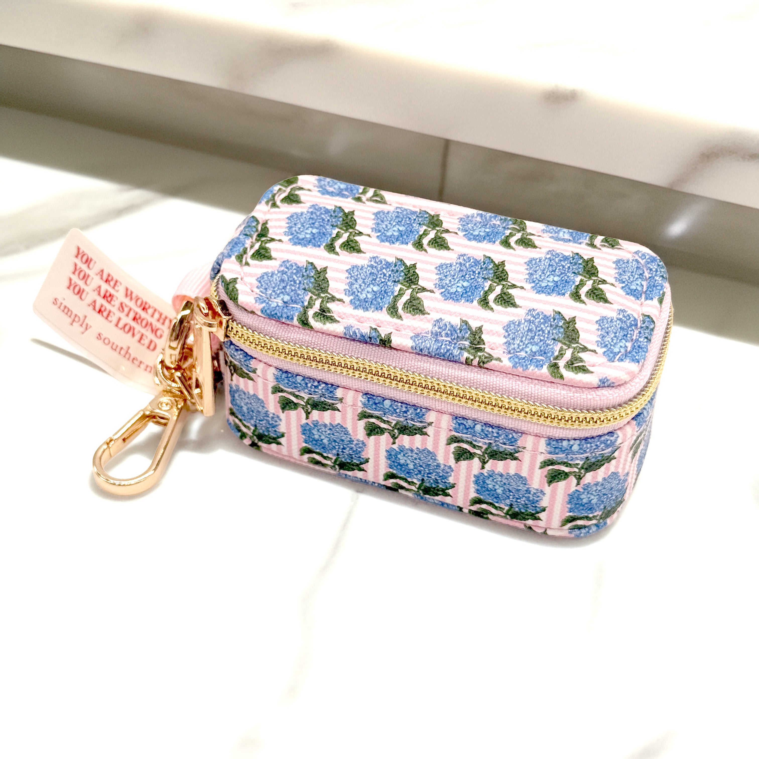 Featuring a gold lobster clasp keychain, this mini case easily clips onto your bag, keys, or travel tote so you can keep everything close at hand. The interior includes soft-lined ring rolls and stud holders to protect your pieces from tangling or damage. Finished with a beautiful floral patchwork design and Simply Southern logo detail, it’s both functional and stylish.