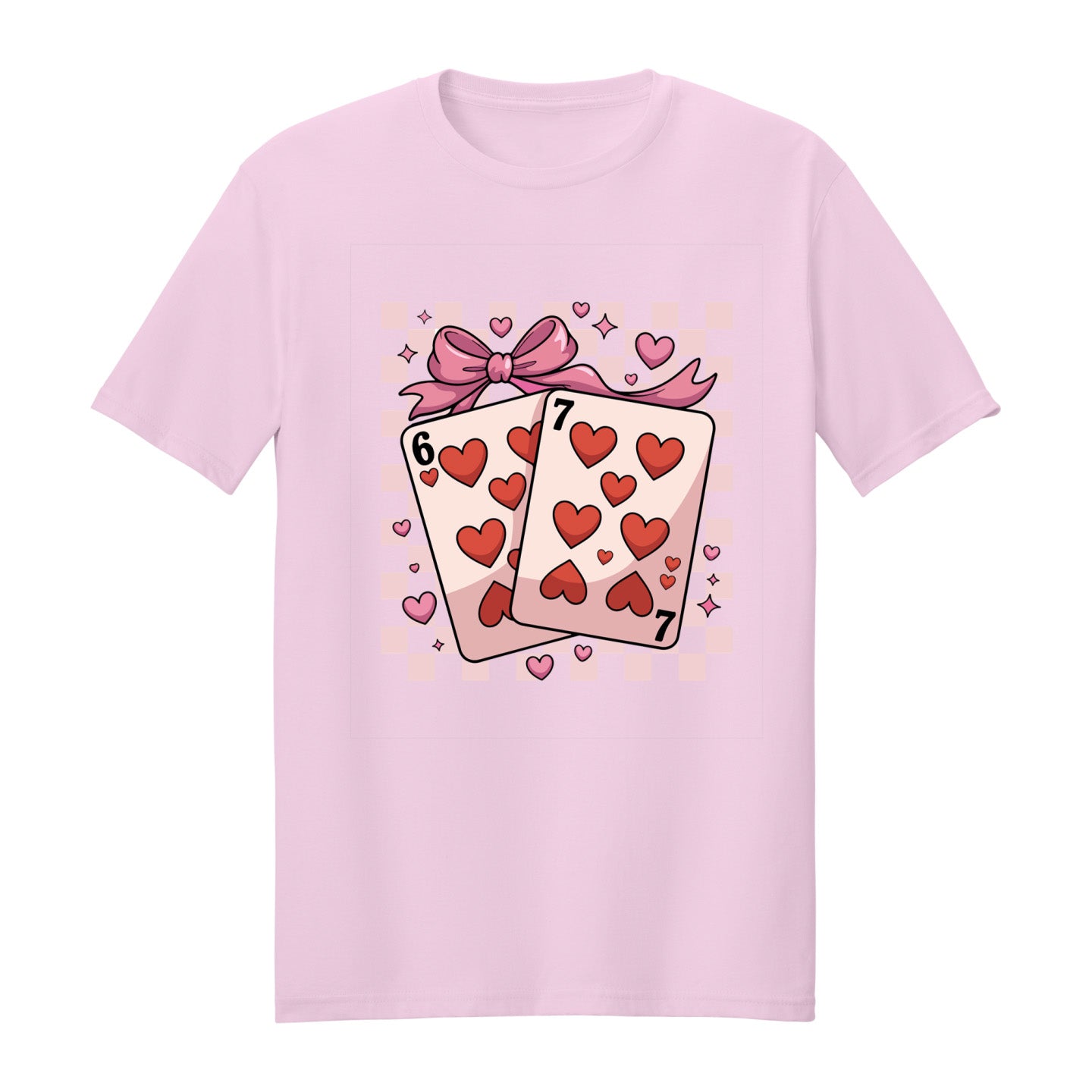 Playful, trendy, and a little lucky — the Lucky 6 & 7 Hearts Youth And Adult T-Shirt from Back Porch Apparel features the popular six and seven of hearts card combo kids love right now. With a fun heart-filled design, cute bow detail, and cheerful pink color, this tee brings style and personality together in an easy-to-wear look.