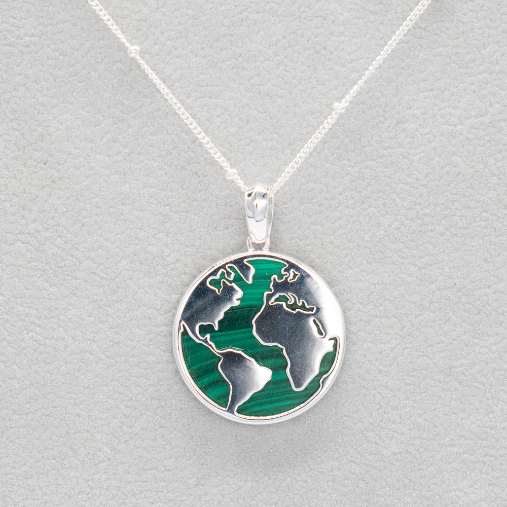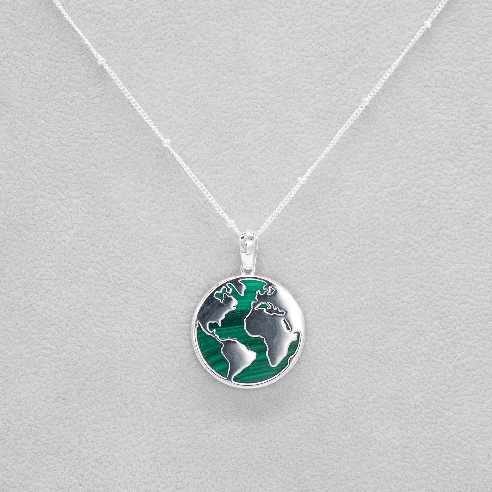 Sterling Silver Globe World Traveler Neckace with Malachite