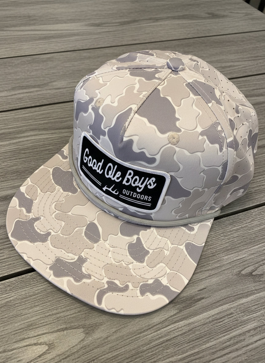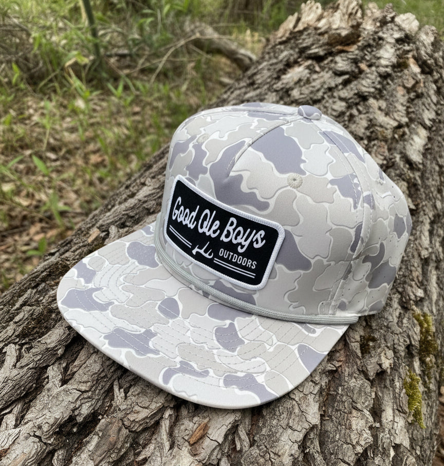 Embrace rugged style with the Good Ole Boys Light Camo Snap Back Hat. This unisex cap features a striking camouflage pattern, perfect for adding a touch of the outdoors to any outfit. The highlight of the design is the iconic Good Ole Boys Antler Patch, prominently displayed on the front, showcasing your love for adventure and the great outdoors. The adjustable snap back closure ensures a comfortable, customizable fit for all. Whether you're hitting the trails or just enjoying a casual day out, this hat combines functionality with distinctive flair.
