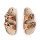 Step into boho-Western elegance with these hand-tooled leather sandals. Featuring delicate silver feather accents and antique buckle details on a cork footbed, these adjustable slides merge free-spirited style with everyday comfort. Perfect for the modern wanderer.