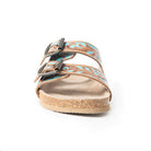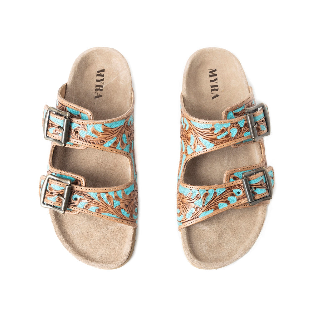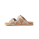 Step into boho-Western elegance with these hand-tooled leather sandals. Featuring delicate silver feather accents and antique buckle details on a cork footbed, these adjustable slides merge free-spirited style with everyday comfort. Perfect for the modern wanderer.