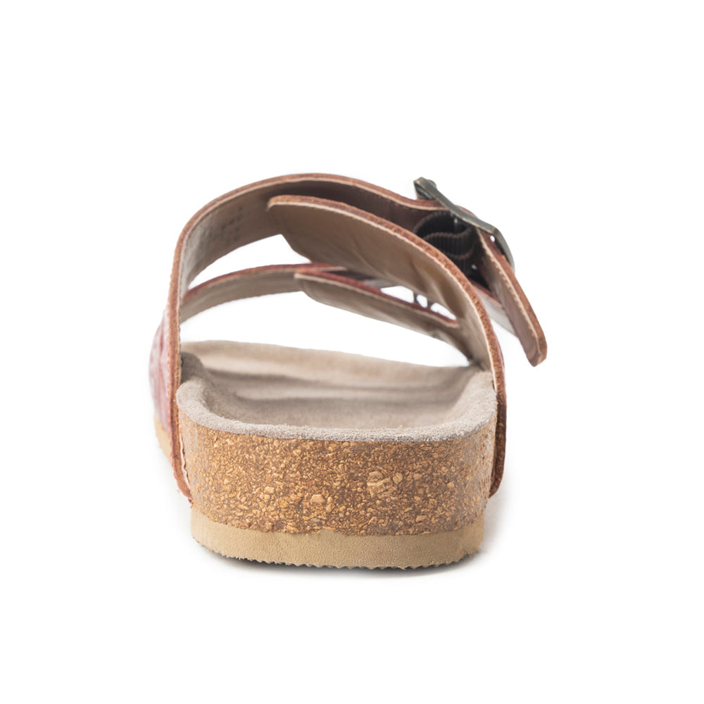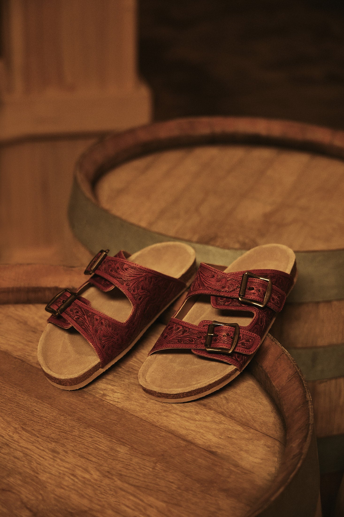 Myra Falling Feather Red Tooled Leather Sandals for Women - Dual Strap Casual Slides with Cushioned Sole for All-Day Comfort