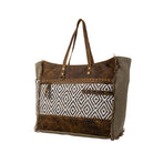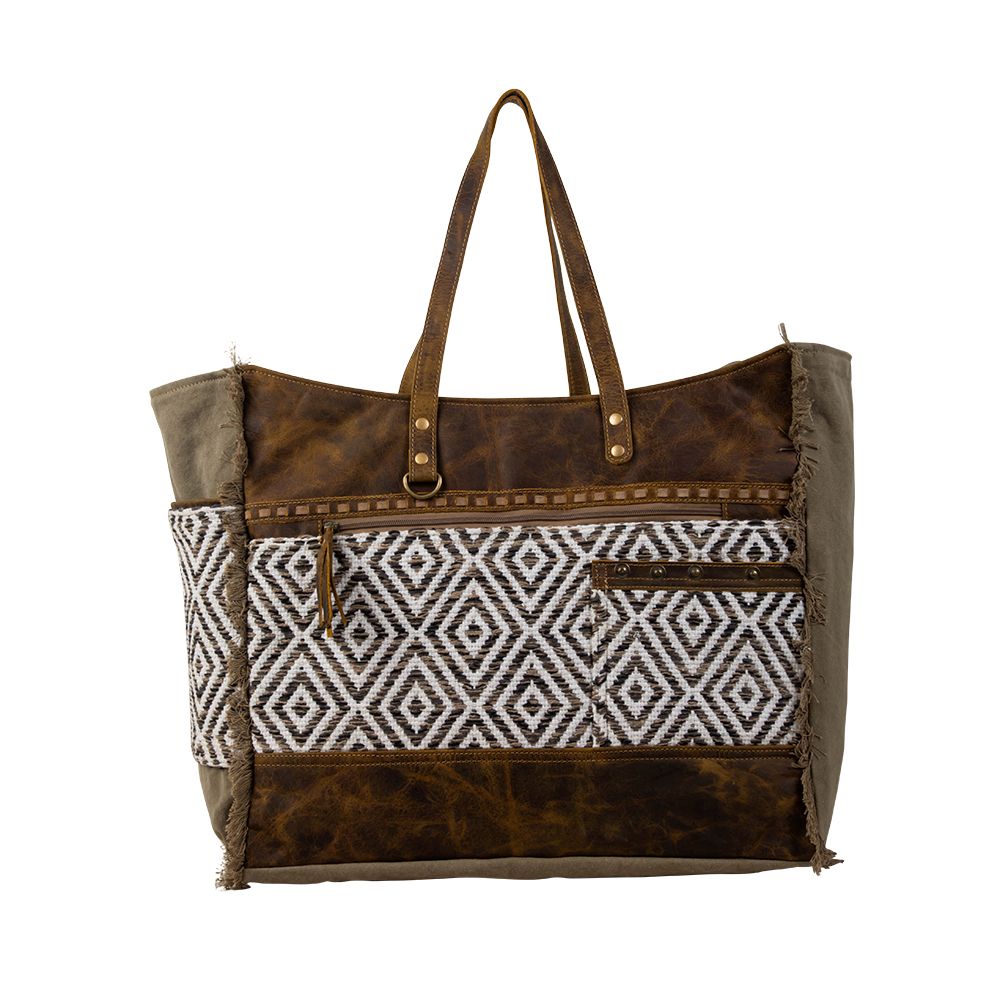 This beautiful bag features the signature upcycled woven rug from our Sand Weaver collection with a striking tribal-inspired pattern. The soothing colors are matched perfectly with special accents in rich chocolate leather. The back and sides are durable olive sandstone woven canvas with a frayed-edge treatment. The roomy interior features a zippered pocket and zipper-close top. Matching durable leather carrying handles.
