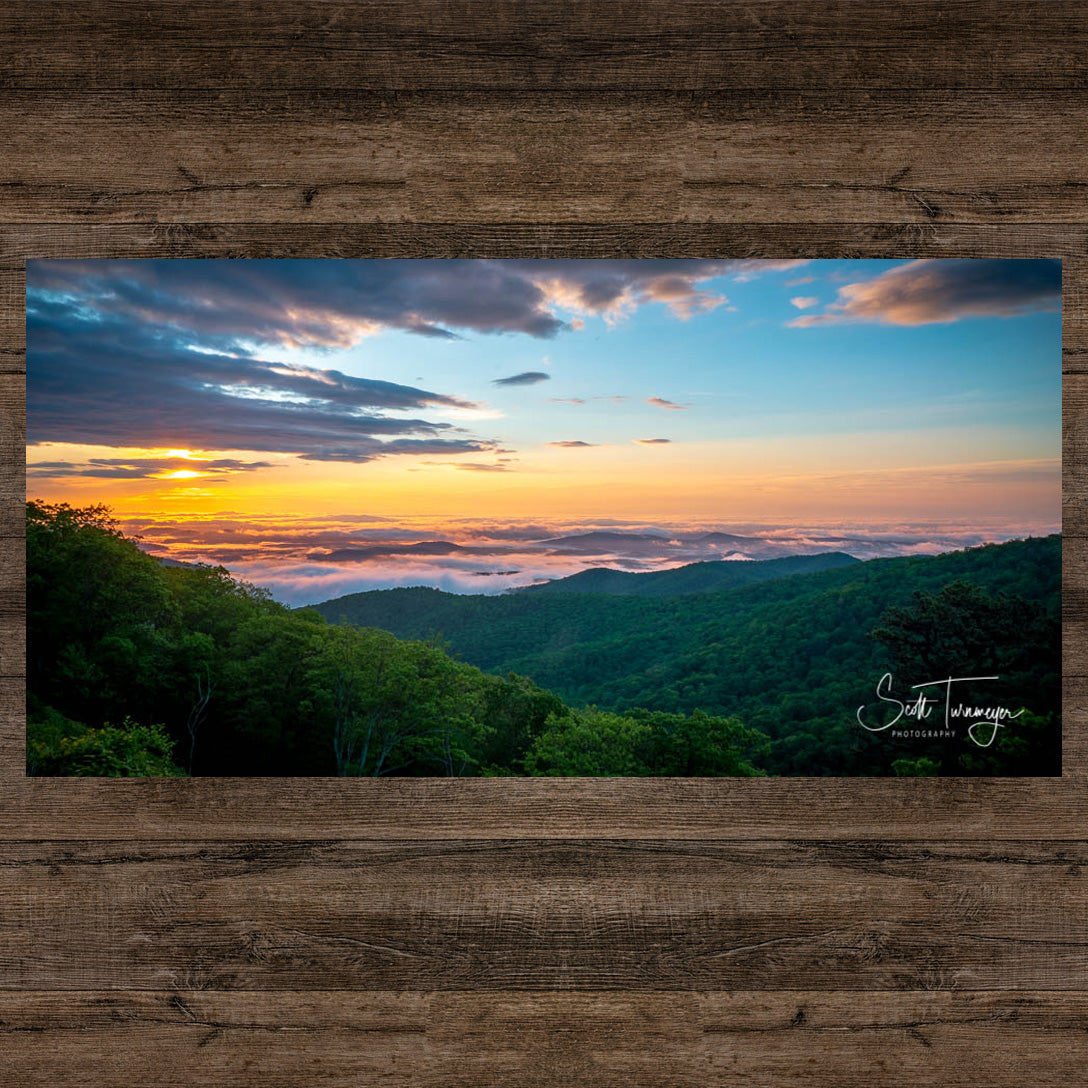 Discover the ethereal beauty of "Rainbow Sunrise," a captivating fine art photograph by Scott Turnmeyer. Taken on a serene spring morning in Shenandoah National Park along the iconic Skyline Drive, this stunning image captures the extraordinary moment when the morning sun casts a rainbow-like spectrum of colors across the formations and clouds in the sky.