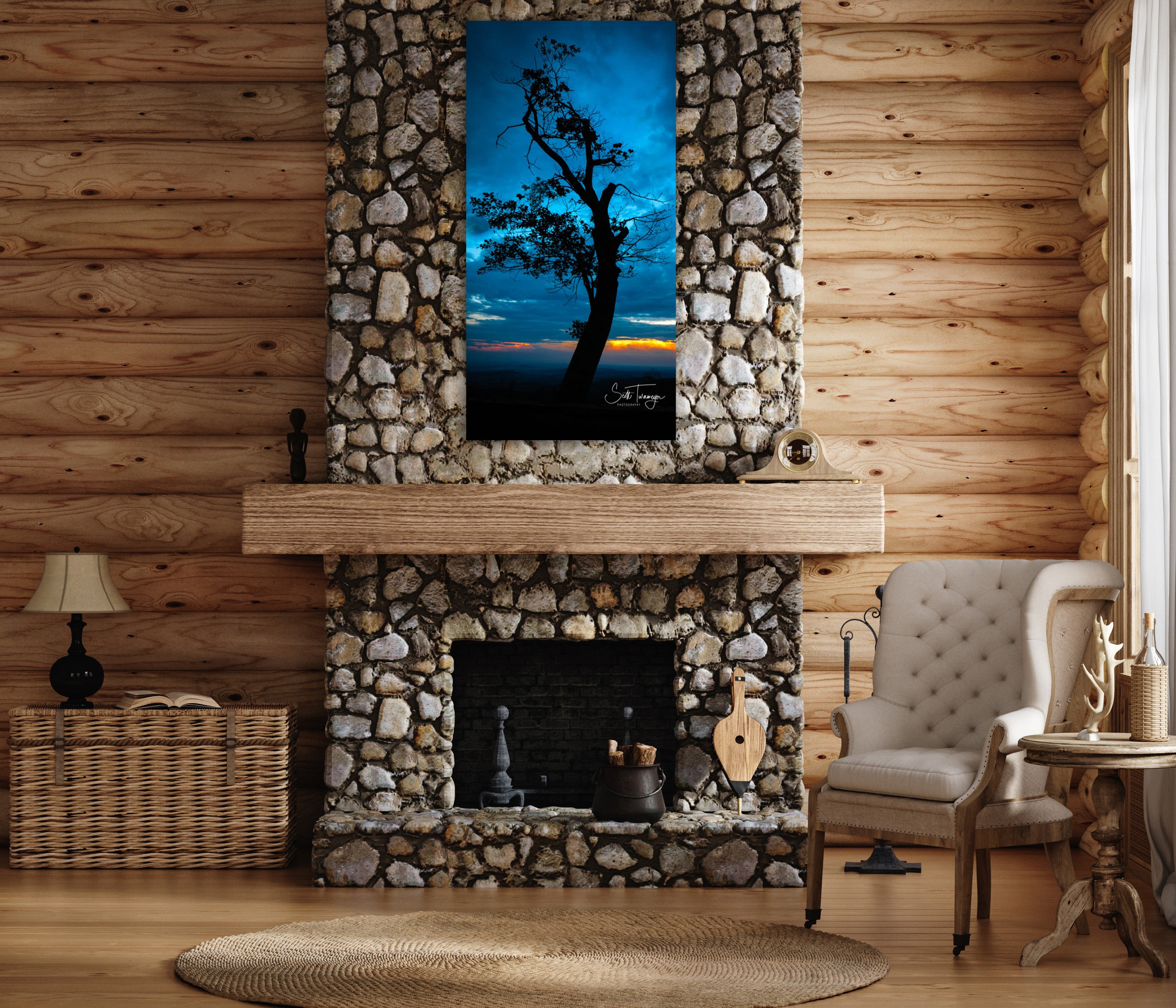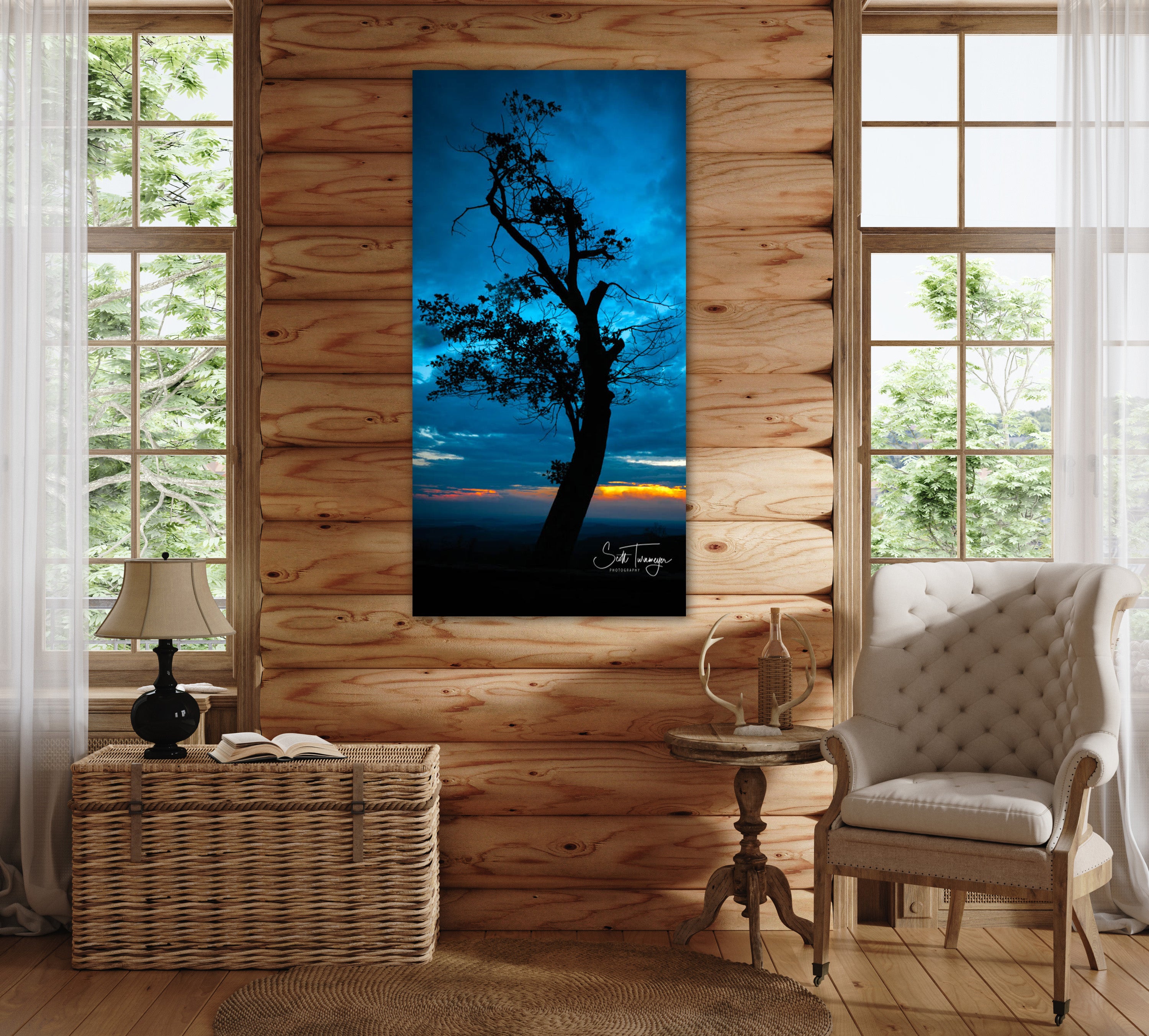 Step into the enchanting beauty of Shenandoah National Park with "The Blue Tree," a captivating fine art photography print by renowned artist Scott Turnmeyer. This striking piece captures the essence of the park's serene landscapes, featuring the silhouette of a unique tree against a backdrop of a breathtaking sunset sky.
