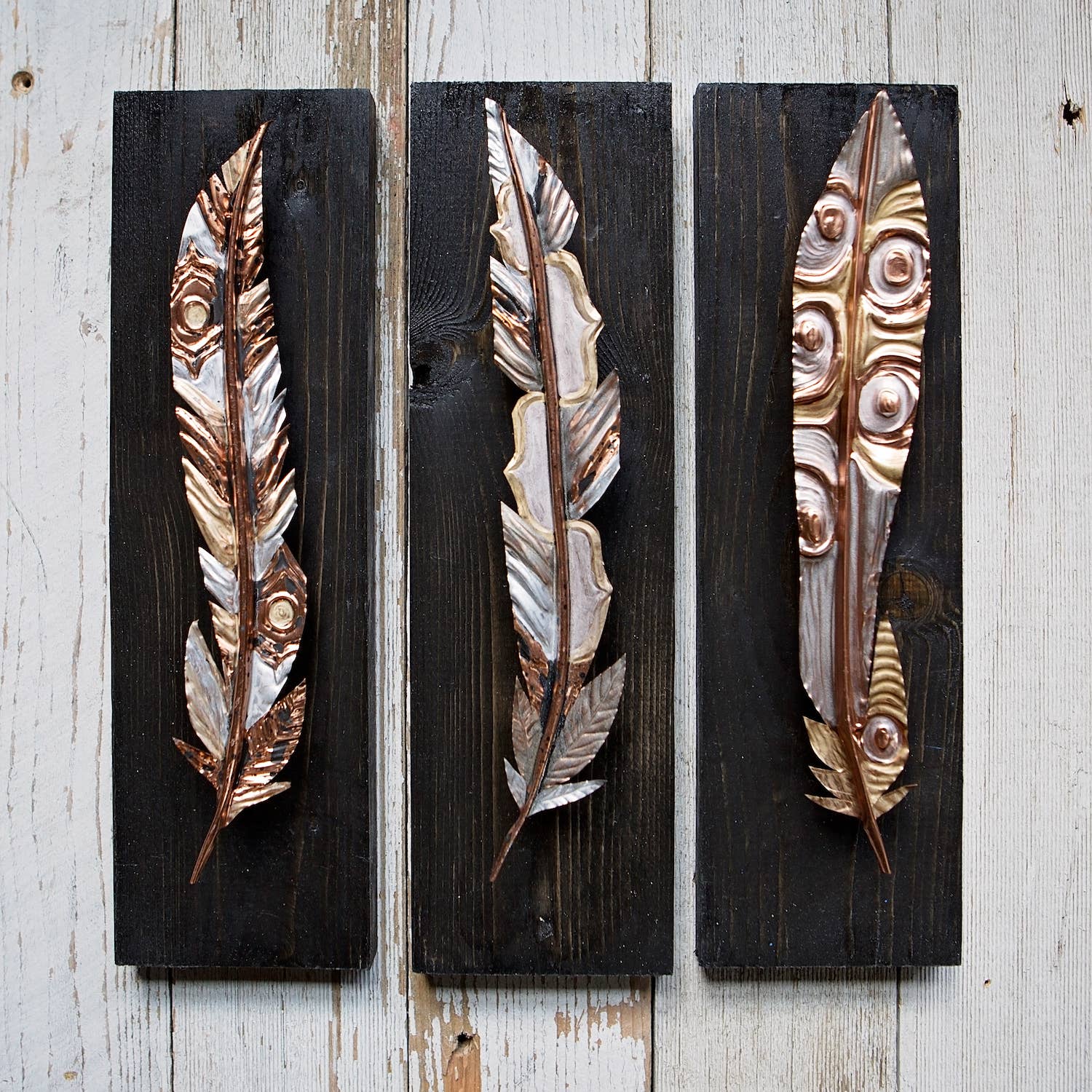 An assortment of rose gold, silver, gold, gunmetal hand painted finish copper feathers. Due to the handmade nature of the pieces, styles vary and no two feathers are alike. Black stained mount board. Keyhole hanger Informational sticker Signed by artist