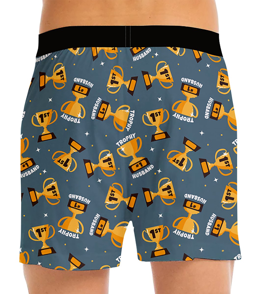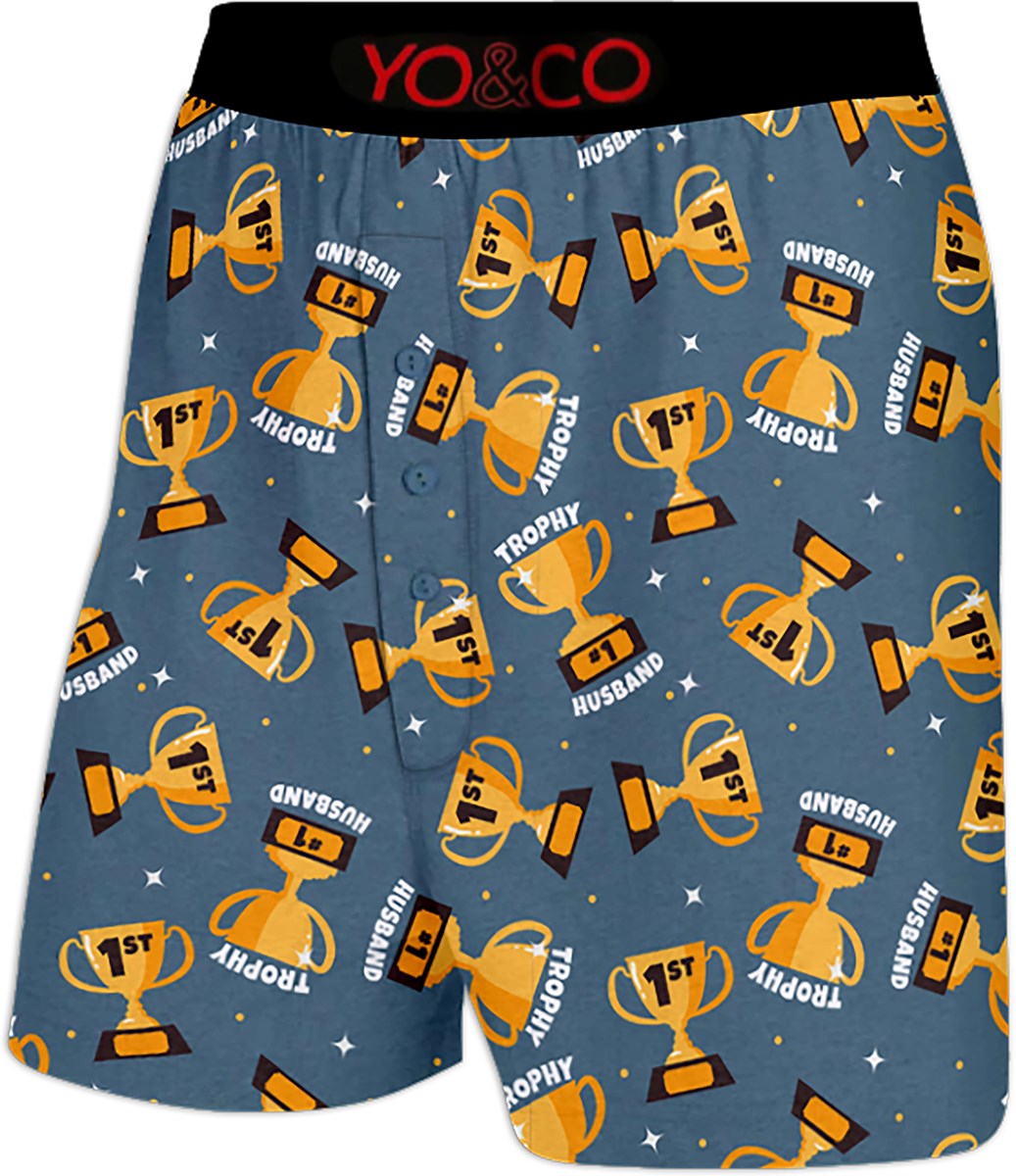 Fun comfortable boxer briefs with an all-over trophy print with 1st TROPHY HUSBAND sentiment. The elastic band on this men's boxer briefs conforms to the human body design, makes this men's underwear comfortable to wear all day long without experiencing tight or pulling. Supportive elastic waistband with Yo & Co Brand logo. 95% Cotton, 5% Spandex.