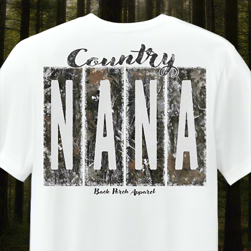 Show off your Southern pride in the Back Porch Apparel Country Nana short sleeve T-shirt. Crafted from a soft, durable cotton-poly blend, it features a bold camouflage print on the back with the proud Country Nana statement. Perfect for casual days, family gatherings, or time outdoors, this tee blends comfort, style, and a little country flair.
