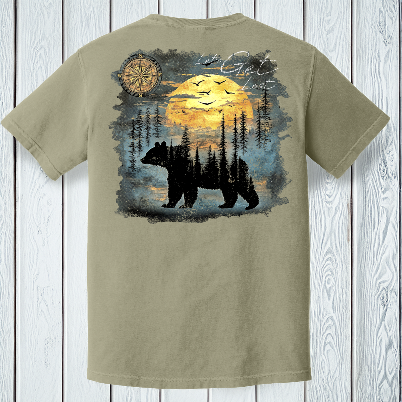 Adventure is calling! The Let’s Get Lost T-Shirt from Back Porch Design features a stunning bear and sunset mountain scene that inspires wanderlust. Made on ultra-soft, ring-spun Comfort Colors blanks, this short sleeve tee is perfect for both men and women who love the great outdoors and want to wear that wild spirit wherever they roam. Whether you're hitting the trails or just dreaming of your next escape, this popular tee delivers comfort and style all day long.
