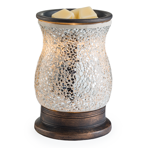 The silver glass mosaic surface of this Illumination Warmer sparkles as it emits a soft glow. Dish is removable; includes warming bulb.