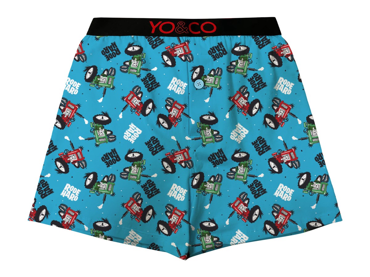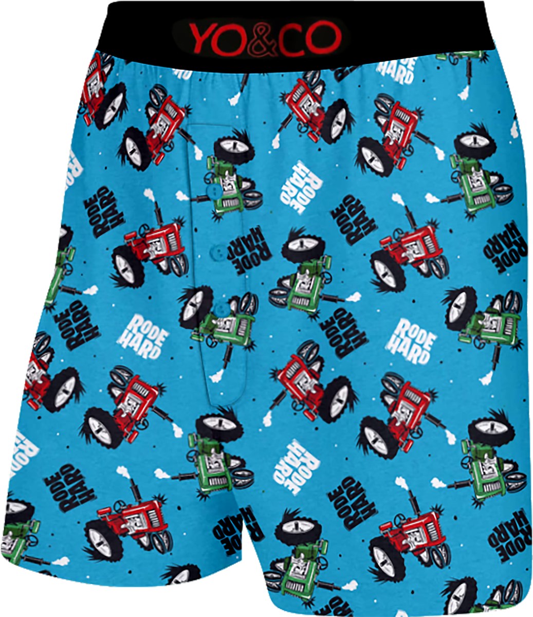 Fun comfortable boxer briefs with an all-over tractor print with RODE HARD sentiment. The elastic band on this men's boxer briefs conforms to the human body design, makes this men's underwear comfortable to wear all day long without experiencing tight or pulling. Supportive elastic waistband with Yo & Co Brand logo. 95% Cotton, 5% Spandex.