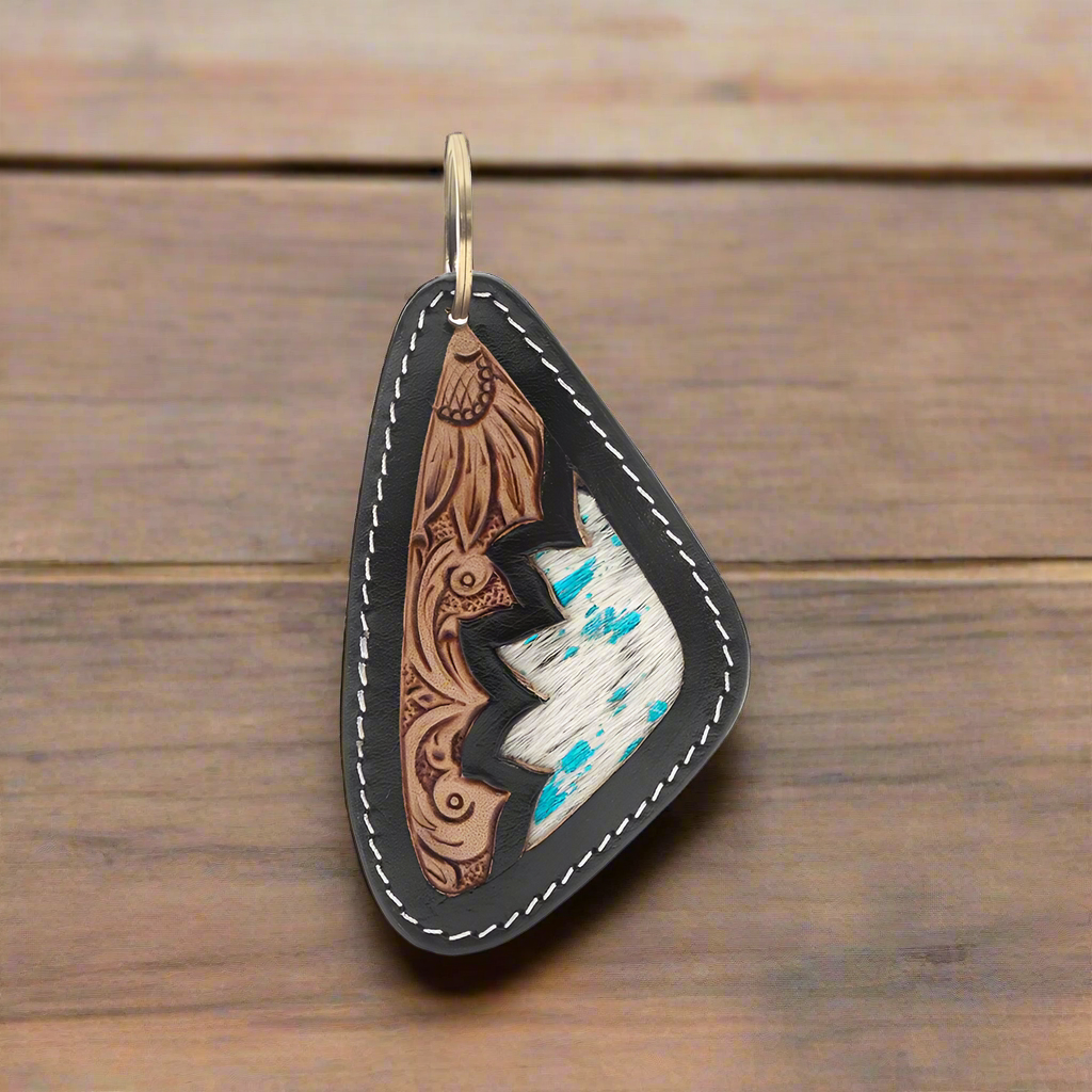Measuring 4.25 inches in length and 2.5 inches in width, this key fob is the perfect size to accompany you on your daily adventures. The combination of hair-on hide and leather creates a striking contrast, while the turquoise foil accents add a touch of vibrant color and flair.
