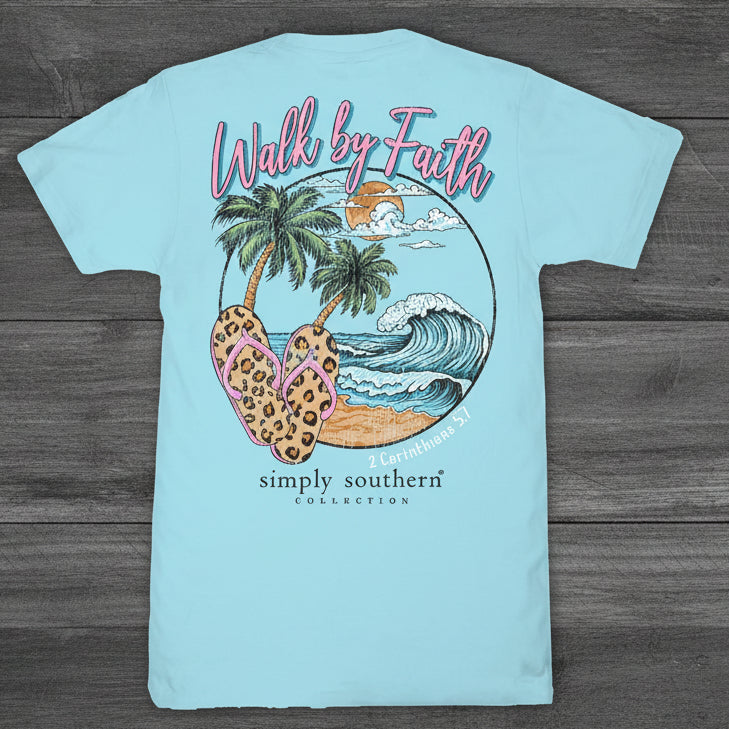 This Simply Southern “Walk by Faith” short sleeve tee blends coastal calm with an uplifting message. Set on a soft Aegean blue shirt, the back graphic features a serene beach scene with rolling waves, palm trees, and leopard-print flip flops beneath the phrase “Walk by Faith.” A subtle scripture reference, 2 Corinthians 5:7, completes the design, reminding you to move forward with trust and confidence.