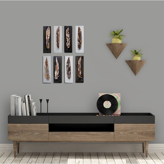 An assortment of rose gold, silver, gold, gunmetal hand painted finish copper feathers. Due to the handmade nature of the pieces, styles vary and no two feathers are alike. Black stained mount board. Keyhole hanger Informational sticker Signed by artist