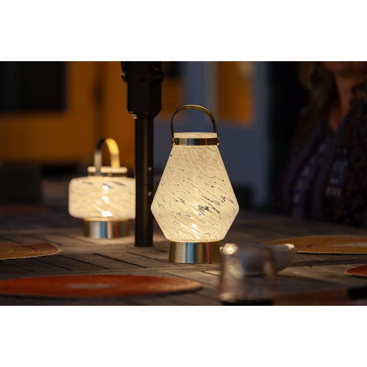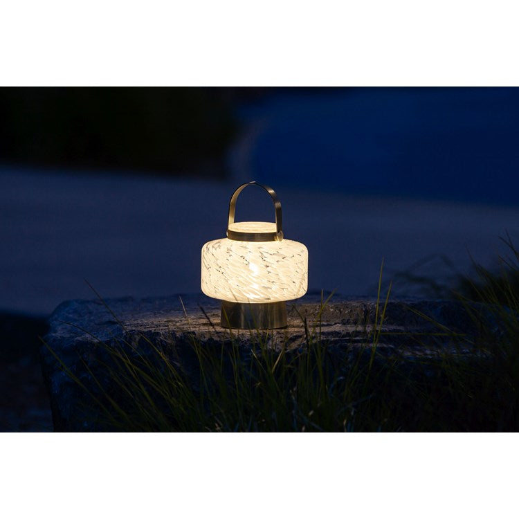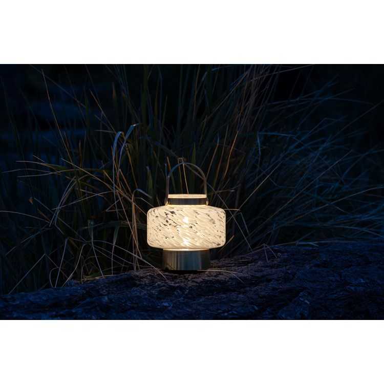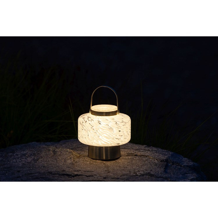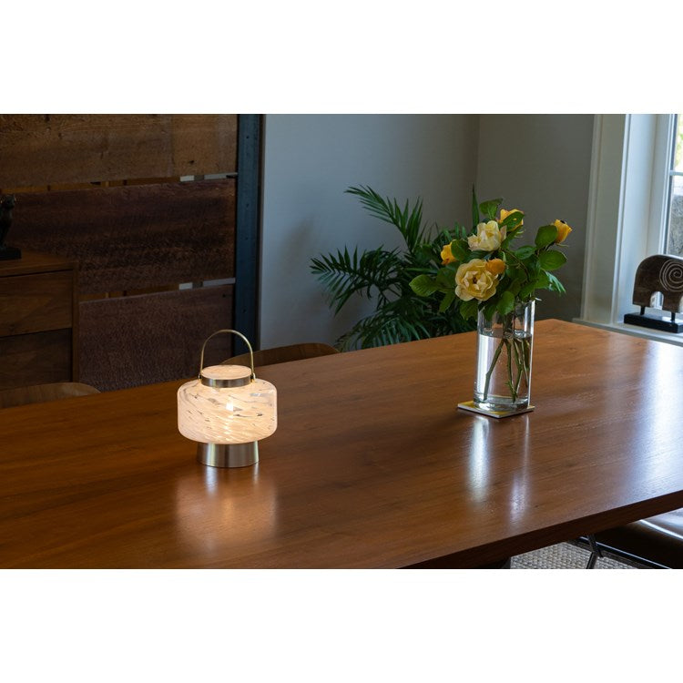 The Lightkeeper lantern was inspired by the simple and beautiful glass lamps used to guide mariners home at night. Created with hand blown glass, this finely crafted lantern features brushed brass colored accents and radiant LEDs that emit a warm white glow. Sophisticated and versatile with an innovative portable design, it’s perfect for use on a bedside table, foyer, or desk top, or take it outside for a picnic or dining alfresco. The lantern is powered by a rechargeable battery and comes with an A/C power adapter. Lantern will glow for 10-12 hours on a full charge.