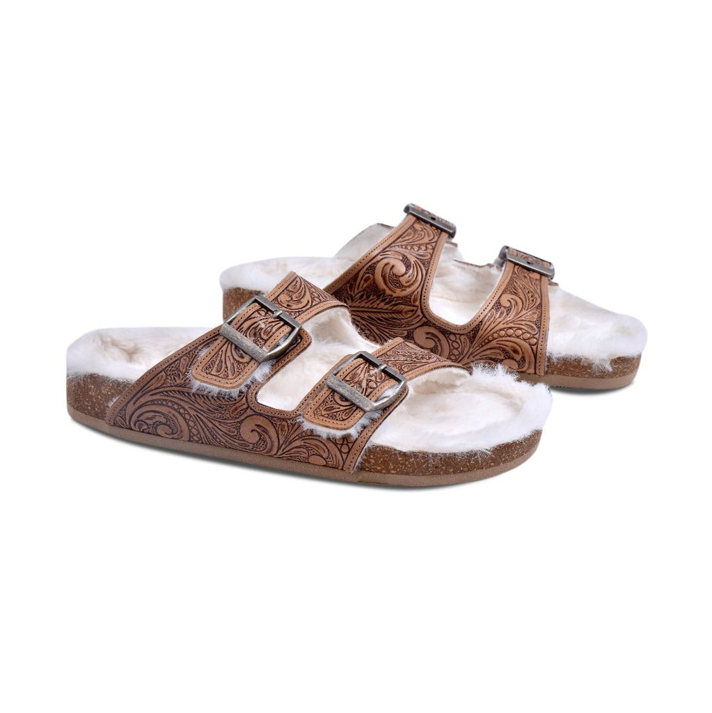 Cozy meets chic with the Trail Winder, Myra Hand Tooled Leather Sandals! Designed for both style and comfort, these unique sandals feature exquisite hand tooled leather straps and bottoms, showcasing expert craftsmanship. Inside, a plush fur lining pampers your feet with warmth and softness, making them the perfect choice for cooler days. Whether you're dressing up or keeping it casual, the Trail Winder Myra sandals add a touch of rustic elegance to any outfit. A must-have for those who appreciate artisanal beauty from the hand-tooled design and everyday comfort.